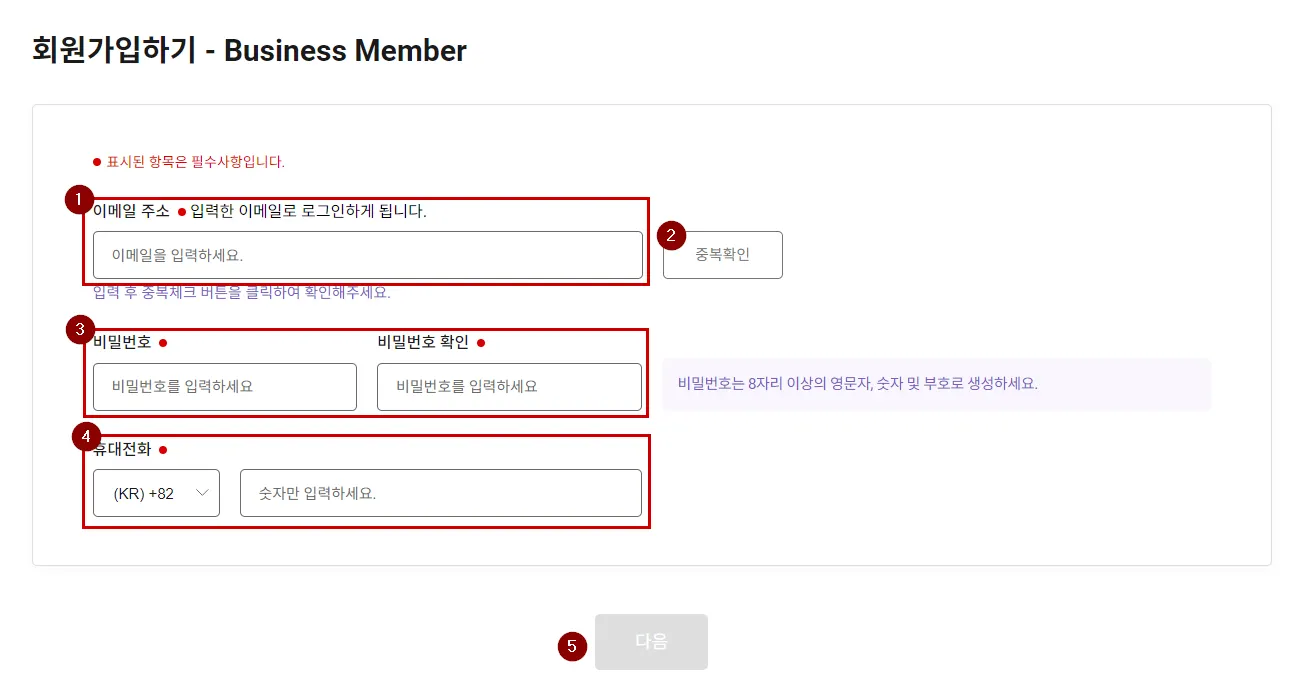 회원 가입의 모든 단계에서 필수적으로 입력해야 하는 항목은 항목 이름 뒤에 • 표시가 있습니다. 올바른 값을 입력하면