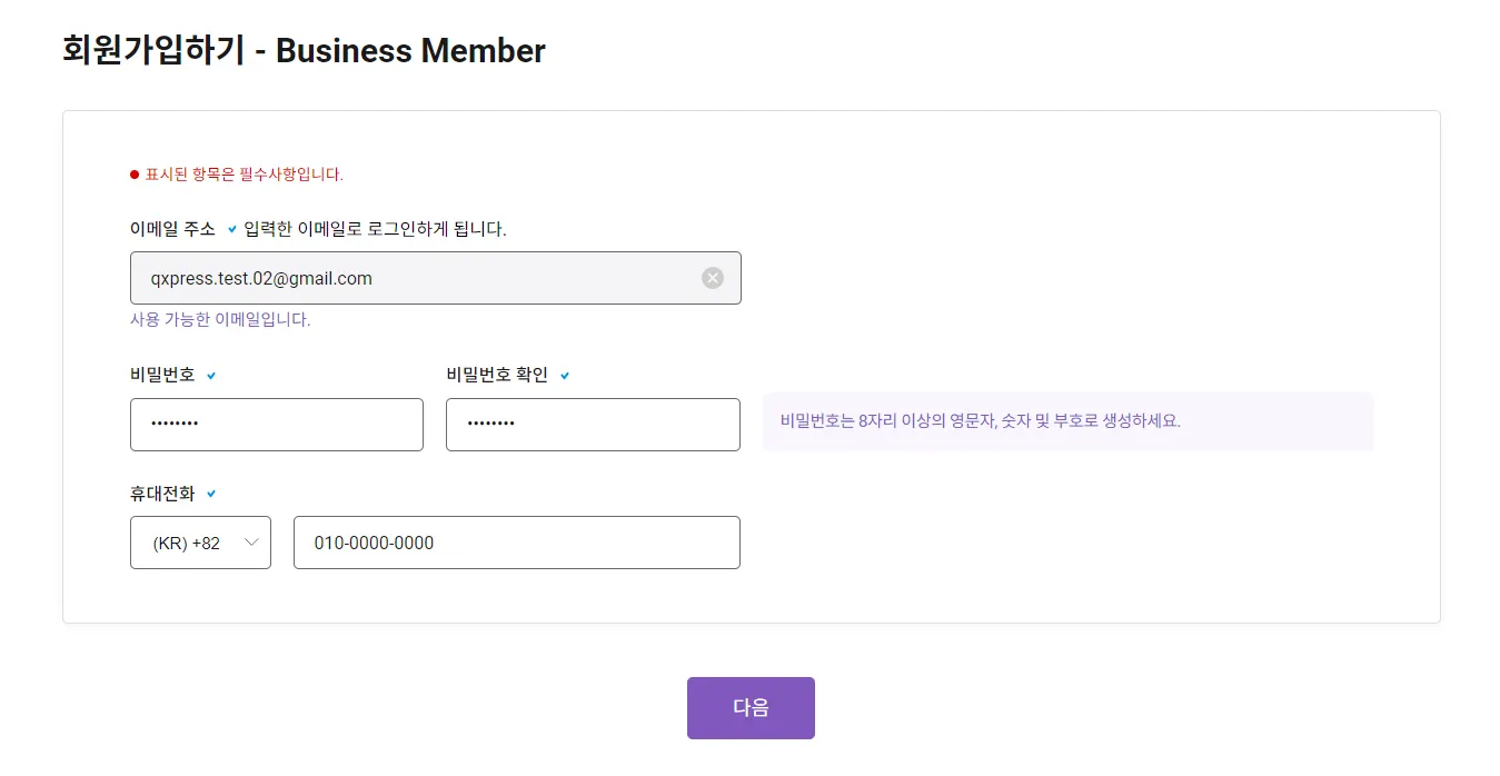 1~4 의 정보를 모두 올바르게 입력했다면 [다음] 버튼이 활성화됩니다. 클릭해 주세요.