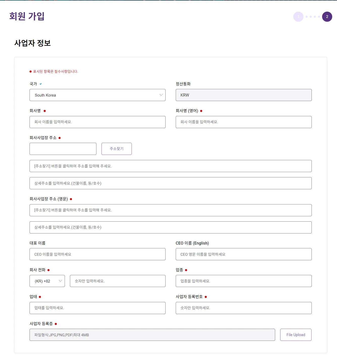 회원 가입 2단계에서는 사업자 정보를 입력합니다. 사업자 정보 중 다음 항목은 필수 입력 사항입니다.