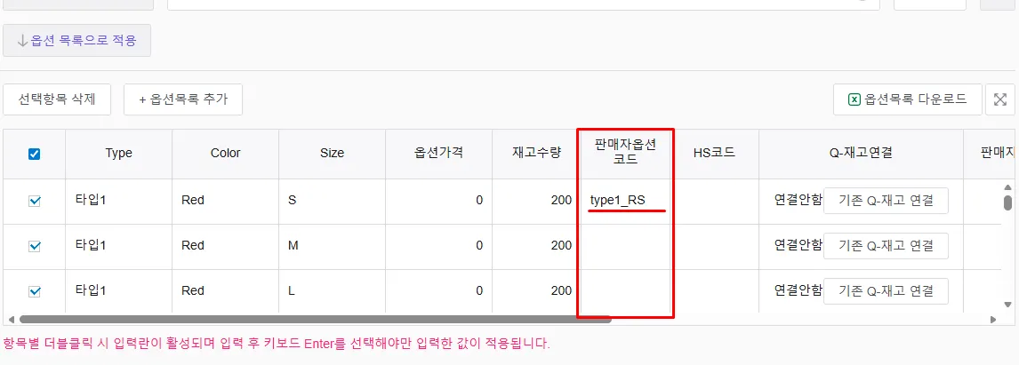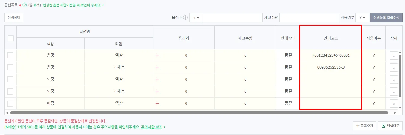 판매자 옵션코드와 동일한 코드가 SKU에 판매자 정의코드로 등록된 경우