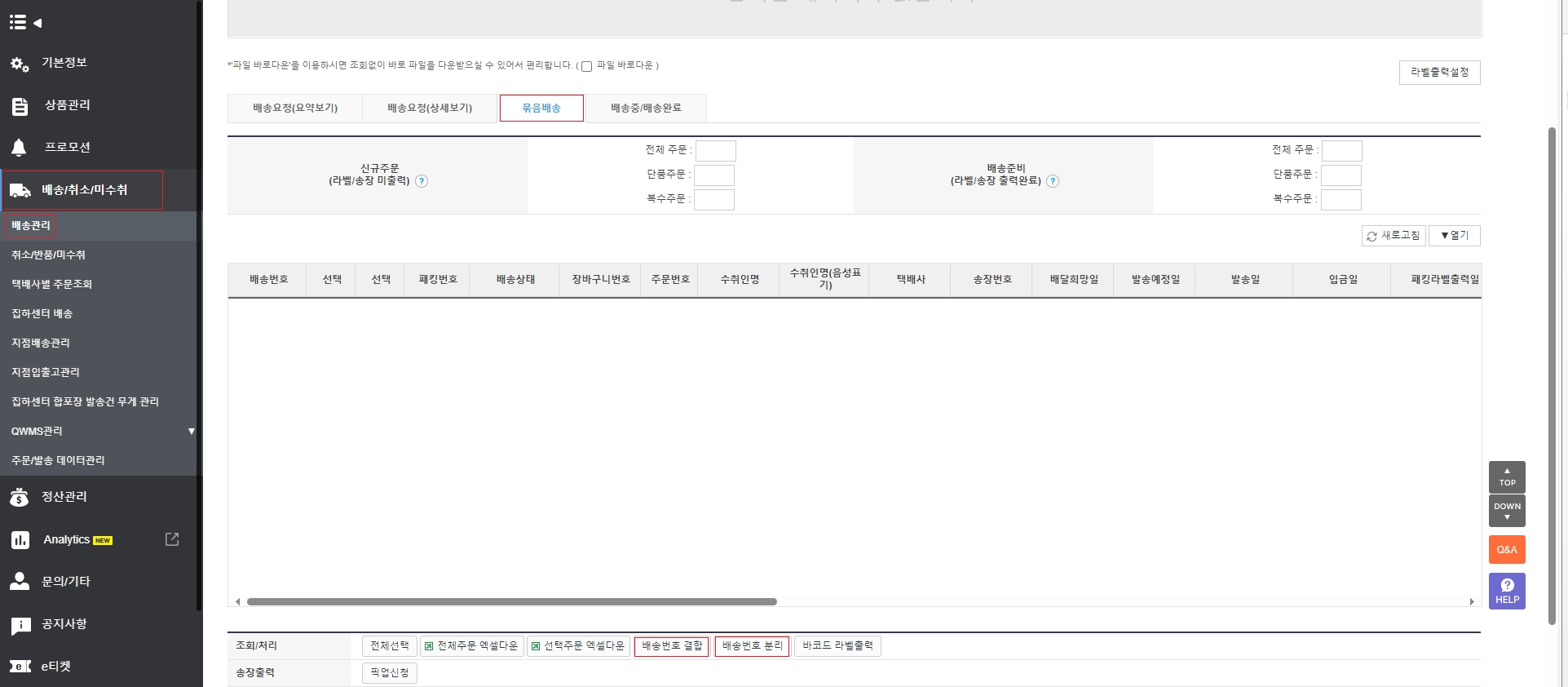 주문번호 선택 후 배송번호 결합 / 배송번호 분리 클릭