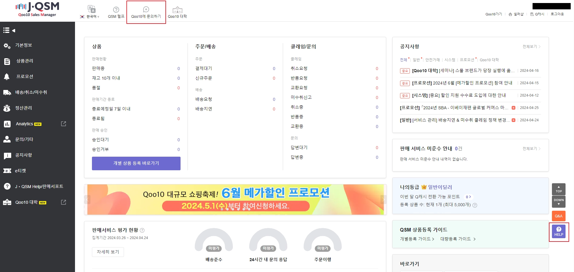 * 그 외 JQSM 이용 방법 및 문의사항은 큐텐에 문의하기 및 우측 바의 HELP 버튼을 통해 확인 가능