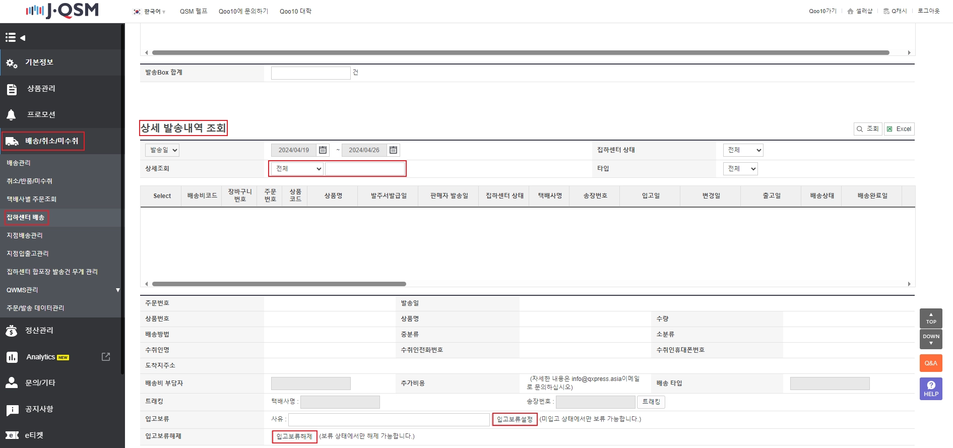 입고 보류 설정은 화물이 큐익스프레스 센터로 입고 전(송장 번호 발번 이전)에만 설정이 가능