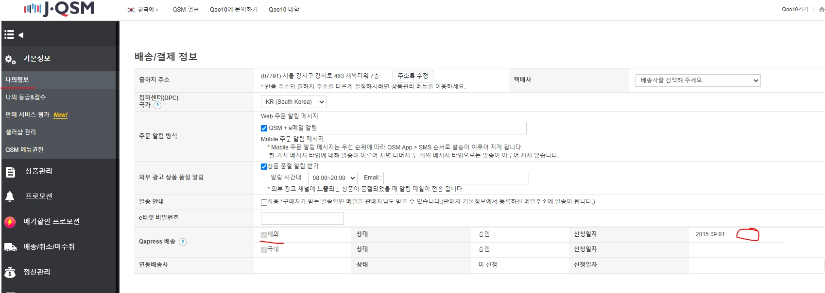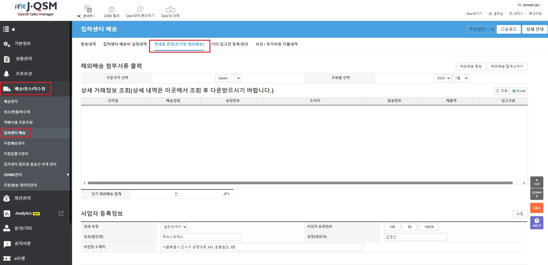 QSM 배송/취소/미수취 > 집하센터 배송 > 영세율 증빙(한국발 해외배송) 메뉴