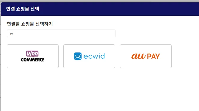 연결할 쇼핑사이트를 선택합니다. 빠르게 찾기 위해서는 쇼핑 사이트 이름의 일부만 타이핑하여 검색하면 빠르게 찾을 수 있습니다.