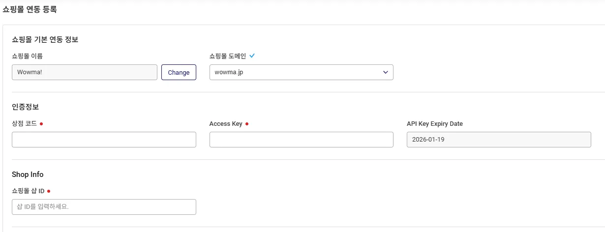 Wowma! 서비스에 대한 API 연결 설정을 위해서는 다음의 정보가 필요합니다. 스마트십에서 API 연결을 설정하기 전에 각 플랫폼 관리도구에서 확인 및 발급을 해주세요.