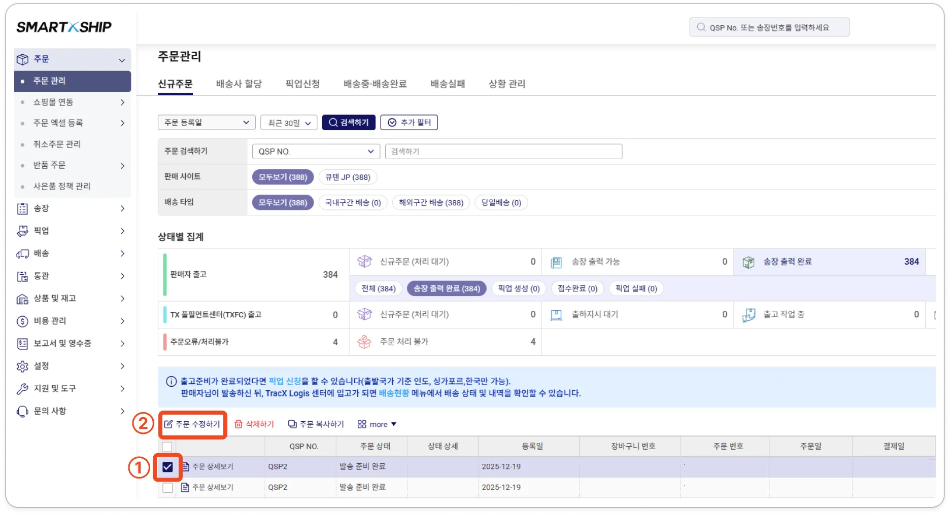 등록된 주문건의 일부 정보를 수정하는 방법입니다.