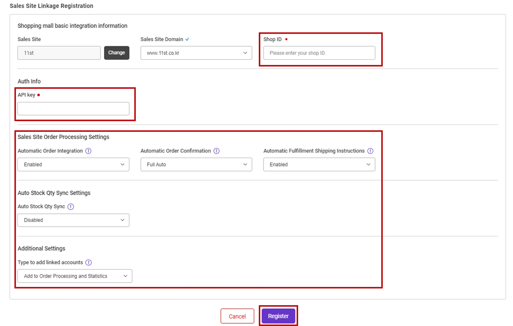 API Key : Enter the API KEY issued by 1. Get API KEY from 11th Street
