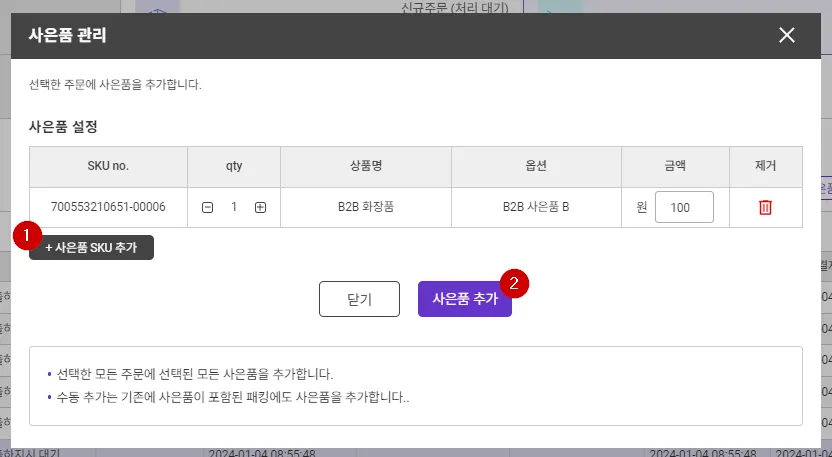 [사은품 추가] 버튼을 클릭하여 추가한 각 사은품을 각각의 수량만큼 선택한 모든 주문에 추가합니다.