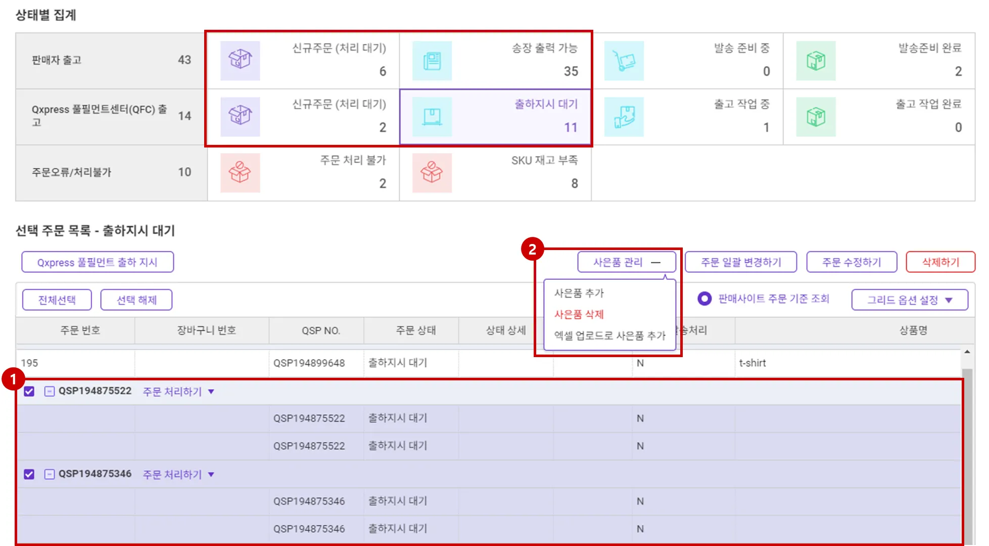 사은품의 추가/삭제는 판매자 출고 주문의 신규주문 및 송장출력가능 상태, 그리고 Qxpress 풀필먼트 센터(QFC) 출고 주문 중 신규 주문 및 출하지시 대기 상태의 주문에 대해서 가능합니다.