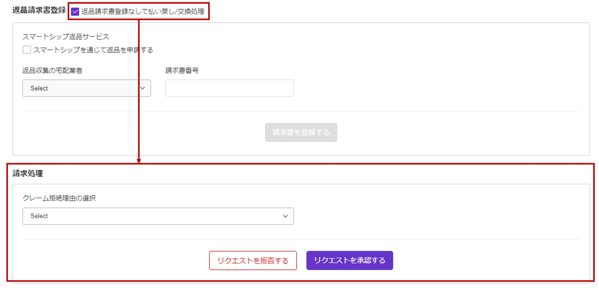 返品請求書の登録なしに承認または拒絶処理をご希望の場合は、「返品請求書登録なしで払い戻し/交換処理」のチェックボックスをクリックしてください。この場合、すぐに拒絶または承認が可能です。
