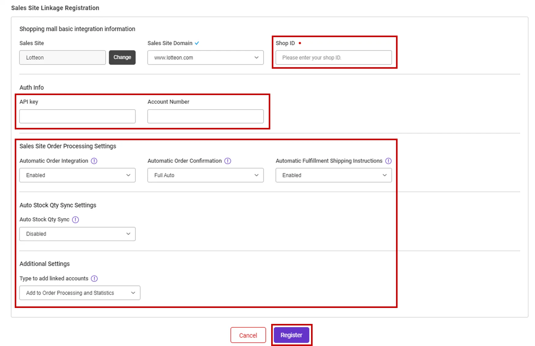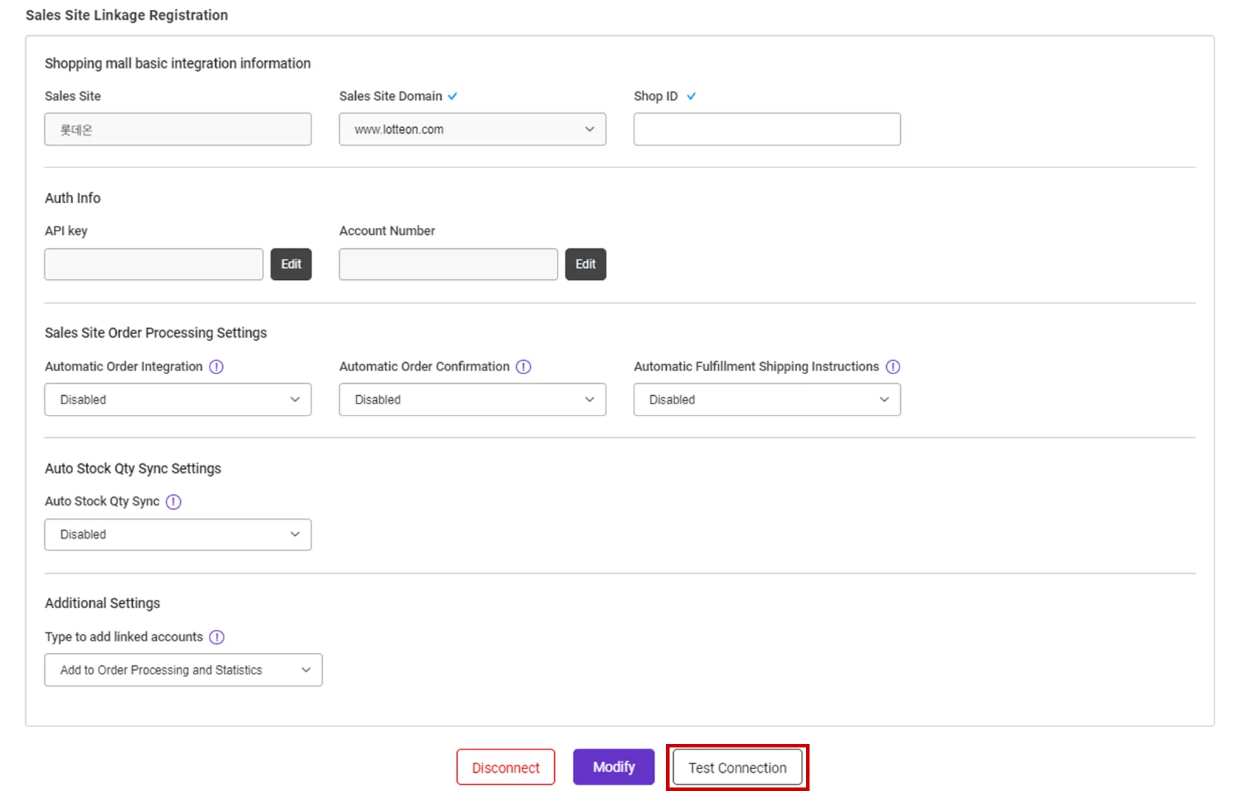 API Key : Enter the API KEY issued by 1. Get API KEY from LotteON.