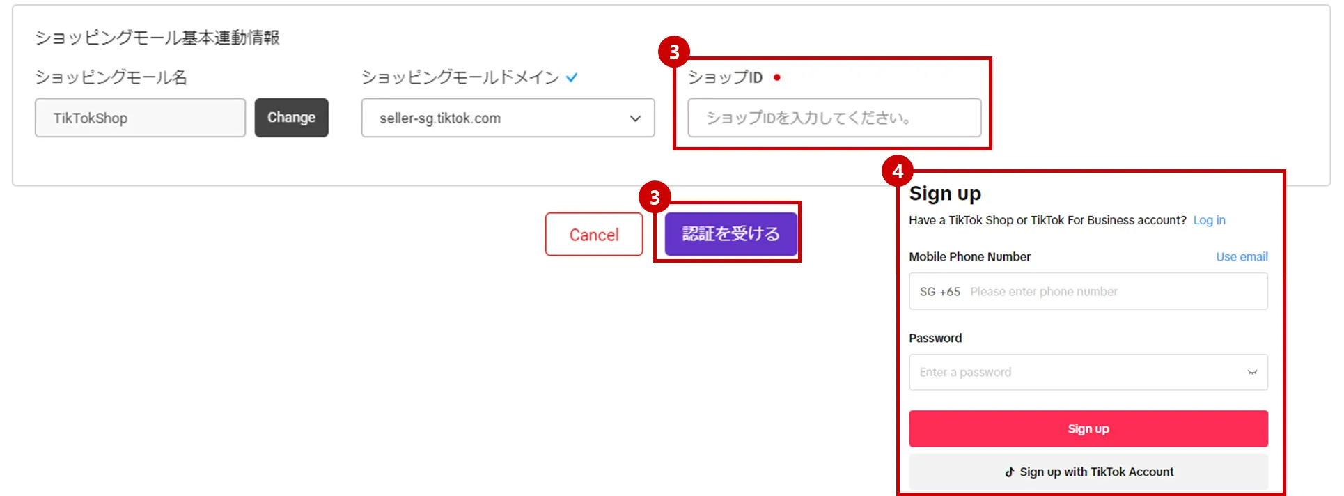 ショップID: TikTokShop IDを記載後、[認証を受ける] ボタンを押してください。