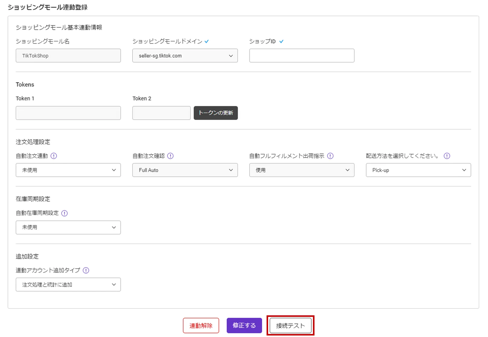 TikTokShop サービスへのAPI接続設定には、次の情報が必要です。