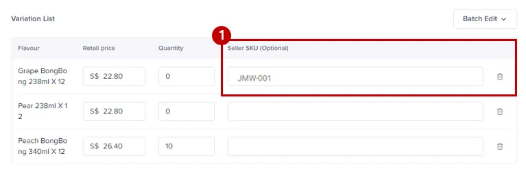 単一商品タイプのSKUを登録し、'販売者定義コード'を入力してください。