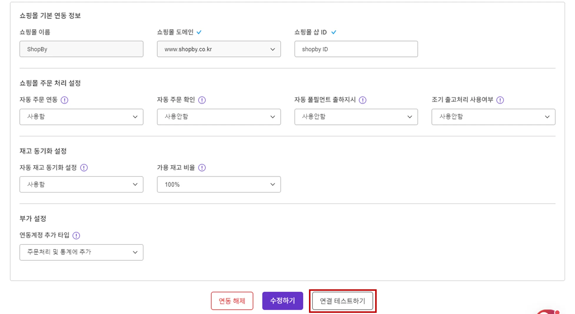 샵바이의 앱스토어에서 스마트십 앱을 설치하신 후, 연동까지 완료되면 쇼핑몰 연동 계정에 샵바이가 추가된 것을 확인하실 수 있습니다. 주문 처리 옵션에 대한 내용은 하단의 ‘API 연결 설정 옵션’을 확인해주세요.