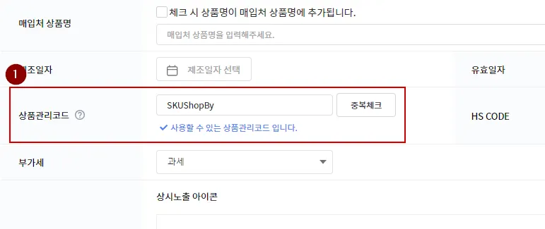 단일 상품 유형의 SKU를 등록하고, ‘판매자 정의 코드’를 입력해주세요.