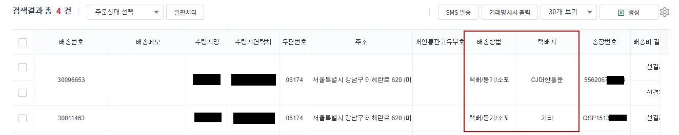 반면에, 스마트십에서 송장을 출력하여 업데이트 하신 경우, 택배사는 Qxpress로, 송장 번호는 QSP…의 형태로 업데이트 됩니다.