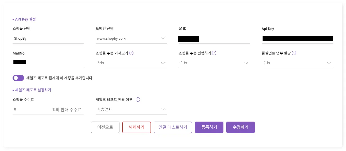 샵바이 서비스에 대한 API 연결 설정을 위해서는 다음의 정보가 필요합니다.