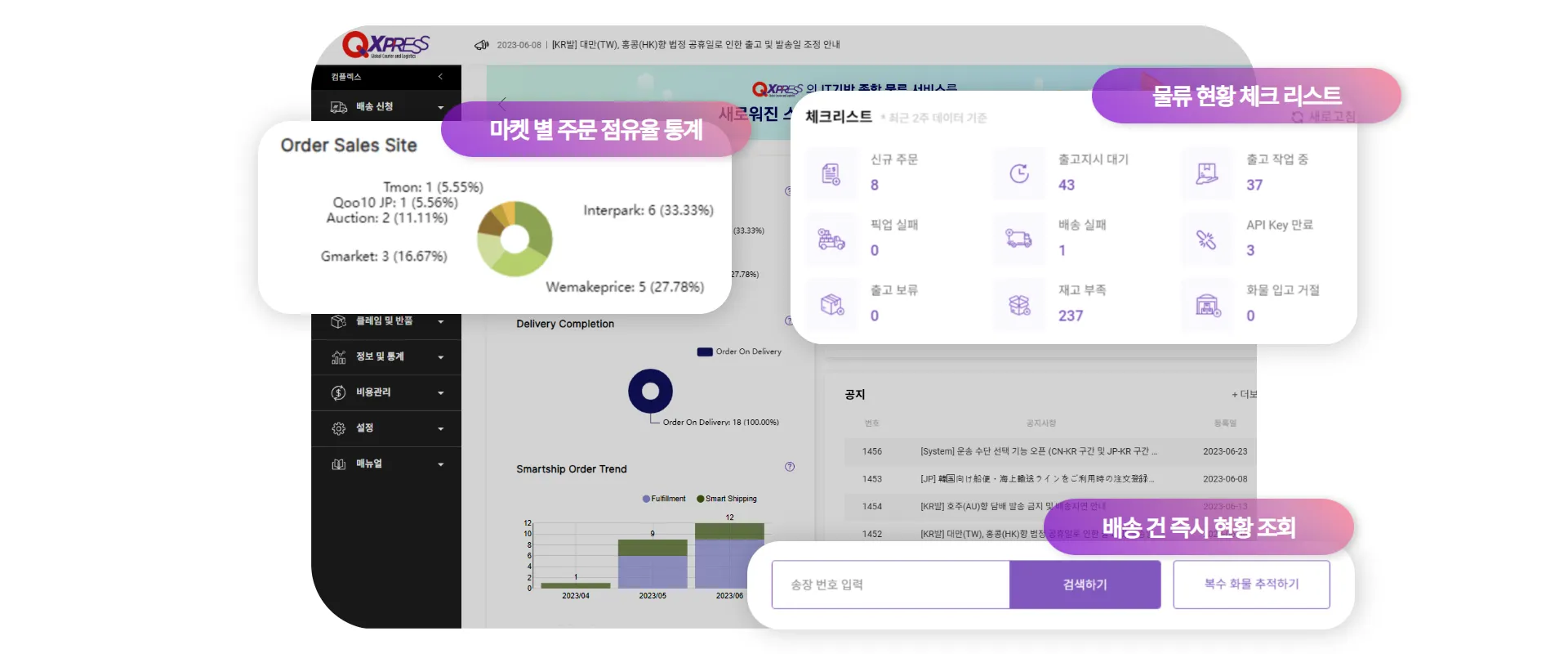 스마트십 메인 화면에서 주문, 배송 상태, 재고 현황을 한 눈에 파악할 수 있습니다