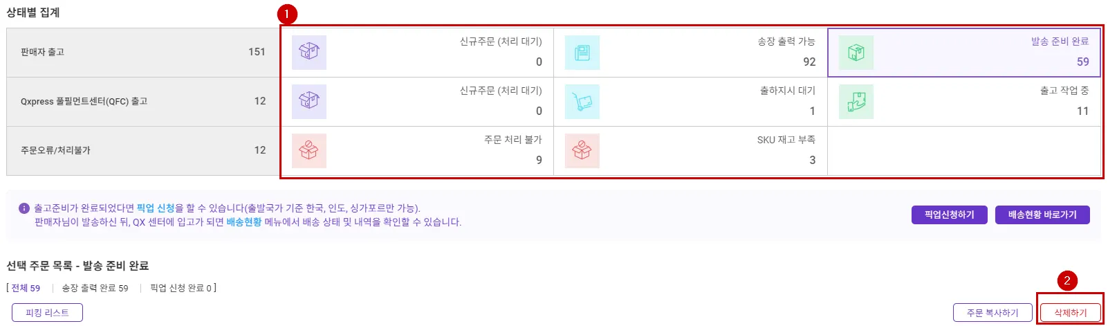 삭제하실 주문을 선택 후 [삭제하기] 버튼을 누르면 주문이 삭제됩니다.