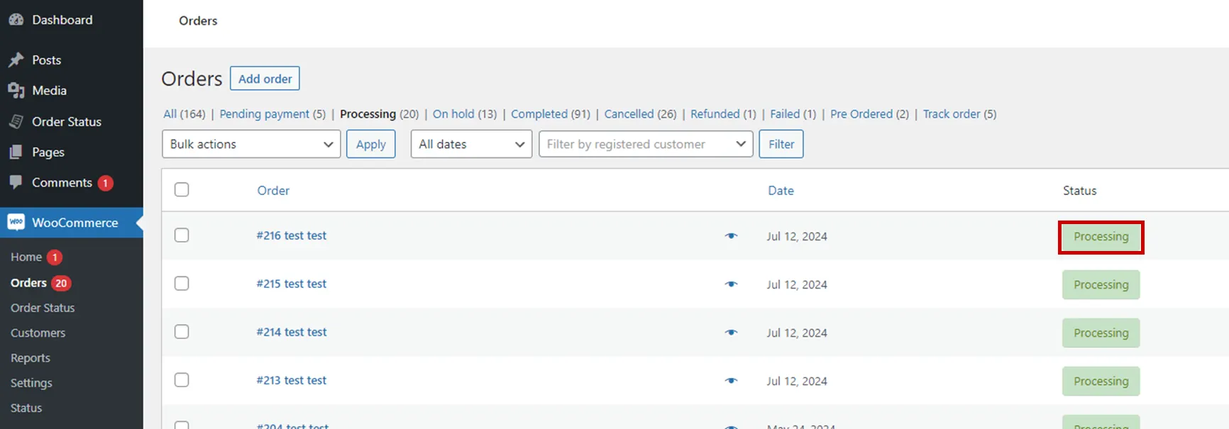 Get an order in "Processing" status among sales orders collected by Woocommerce.