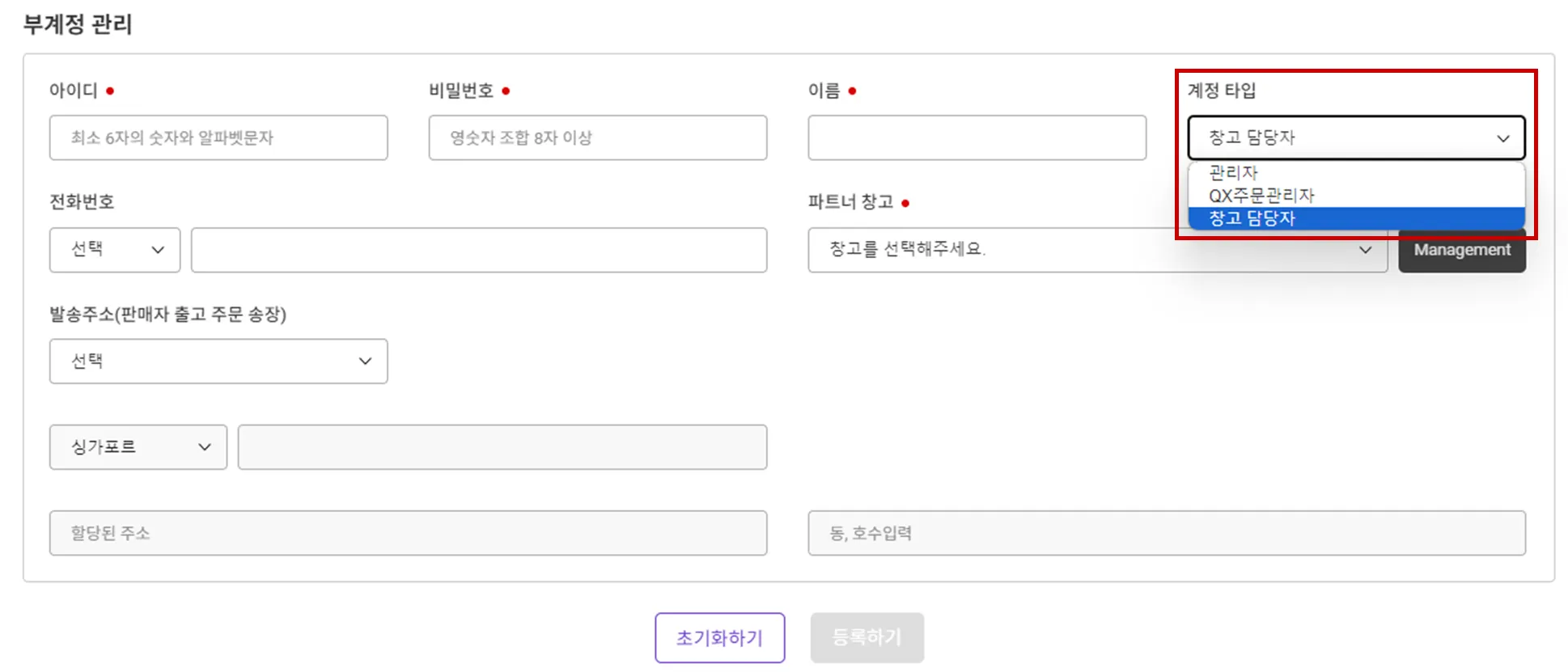 부계정: 계정 타입에 따라 접근 가능한 메뉴가 다릅니다. 계정 타입에는 어드민, QX주문관리, 창고 담당자 세 가지 유형이 있습니다.
