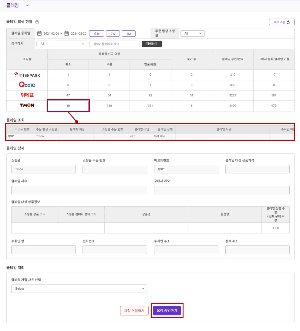 “클레임 조회하기” 그리드의 행을 더블 클릭 하시면 상세 내역을 보실 수 있으며, 내역을 확인하신 후 승인 또는 거절을 눌러주세요. (일부 쇼핑몰은 정책상 바로 취소 거절이 불가능합니다.)