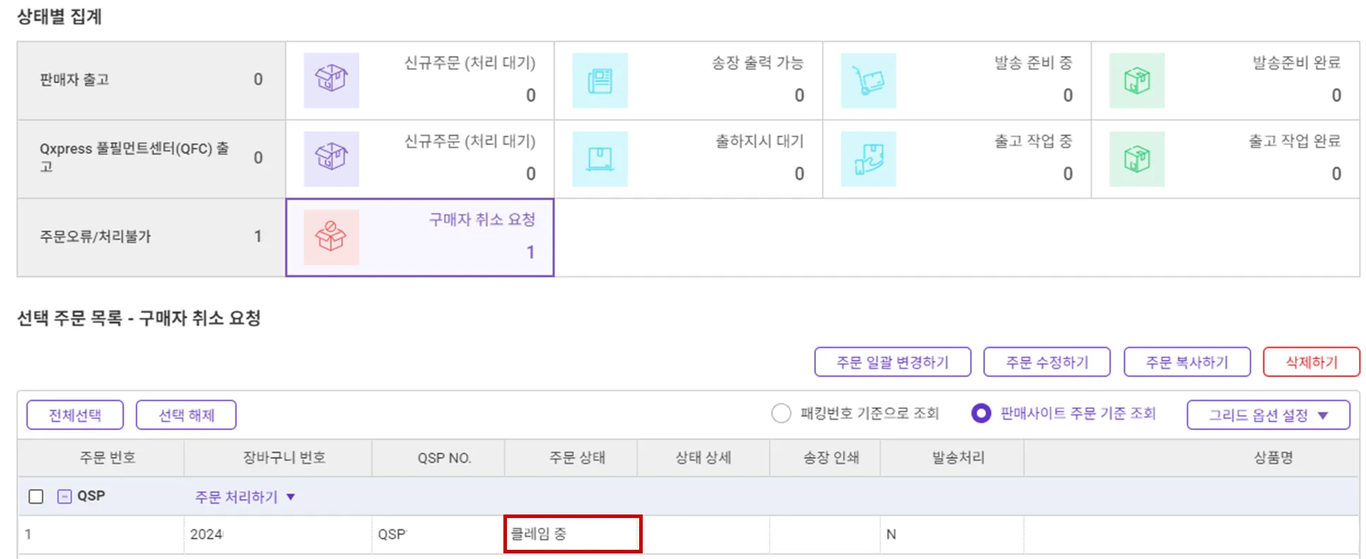 취소 요청이 발생한 주문은, 스마트십 주문 관리 페이지에서 주문 상태가 “클레임 중” 로 변경됩니다.