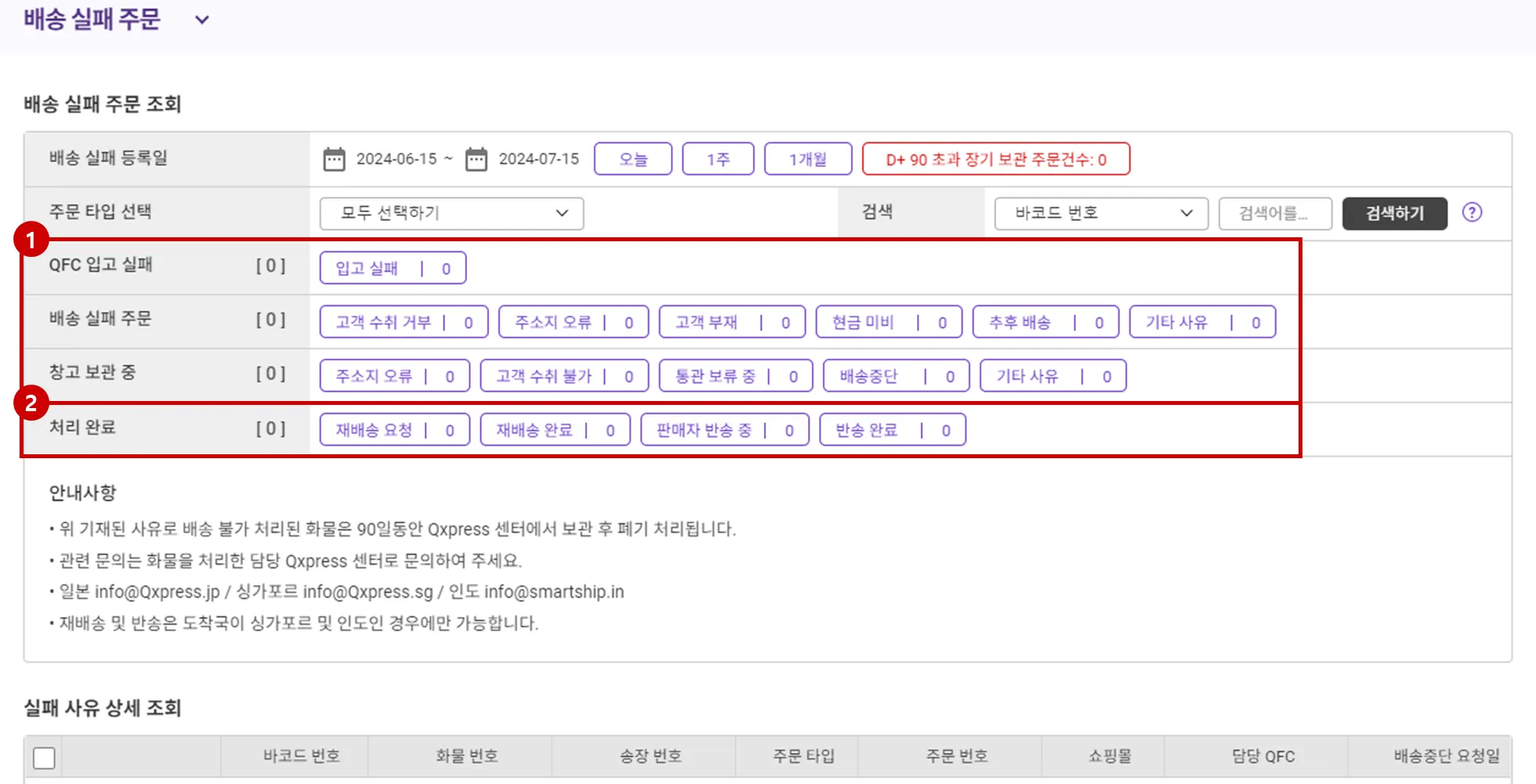 QxMoney 부족 등의 사유로 출발국 창고에서 입고가 되지 않은 주문, 통관 이슈 및 현지 배송사 이슈로 통관사 및 현지 QX 창고, 배송사에서 장기 보관 중하고 있는 주문을 조회하고 처리할 수 있는 메뉴입니다.