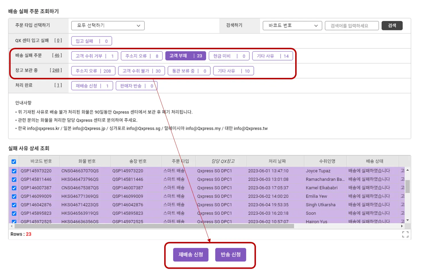 재 배송 또는 반송을 요청하시면 QX 현지 창고에서 확인 후 처리를 도와드립니다.
