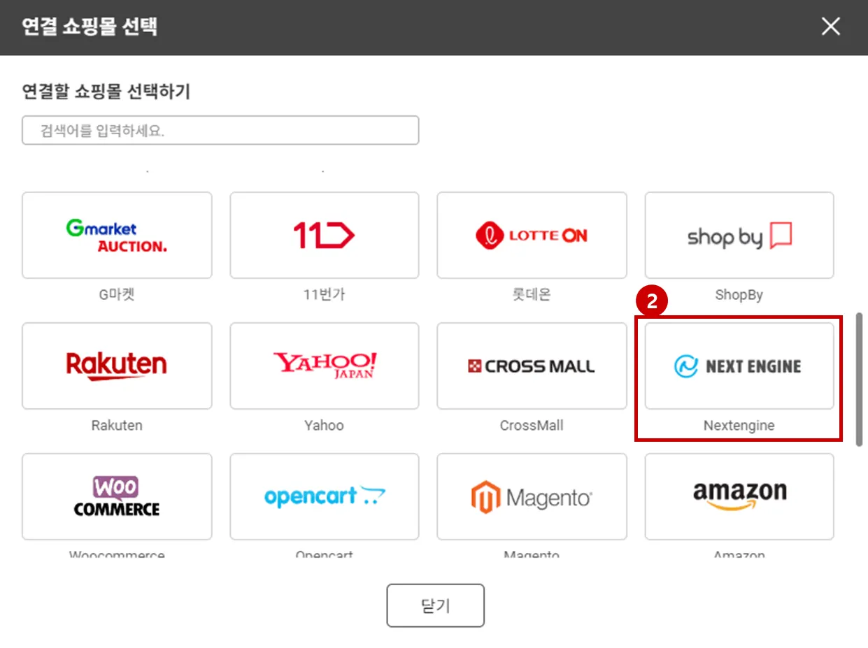 “NextEngine”을 선택한 후, 하단의 "쇼핑몰 연동 등록"으로 스크롤을 이동해주세요.