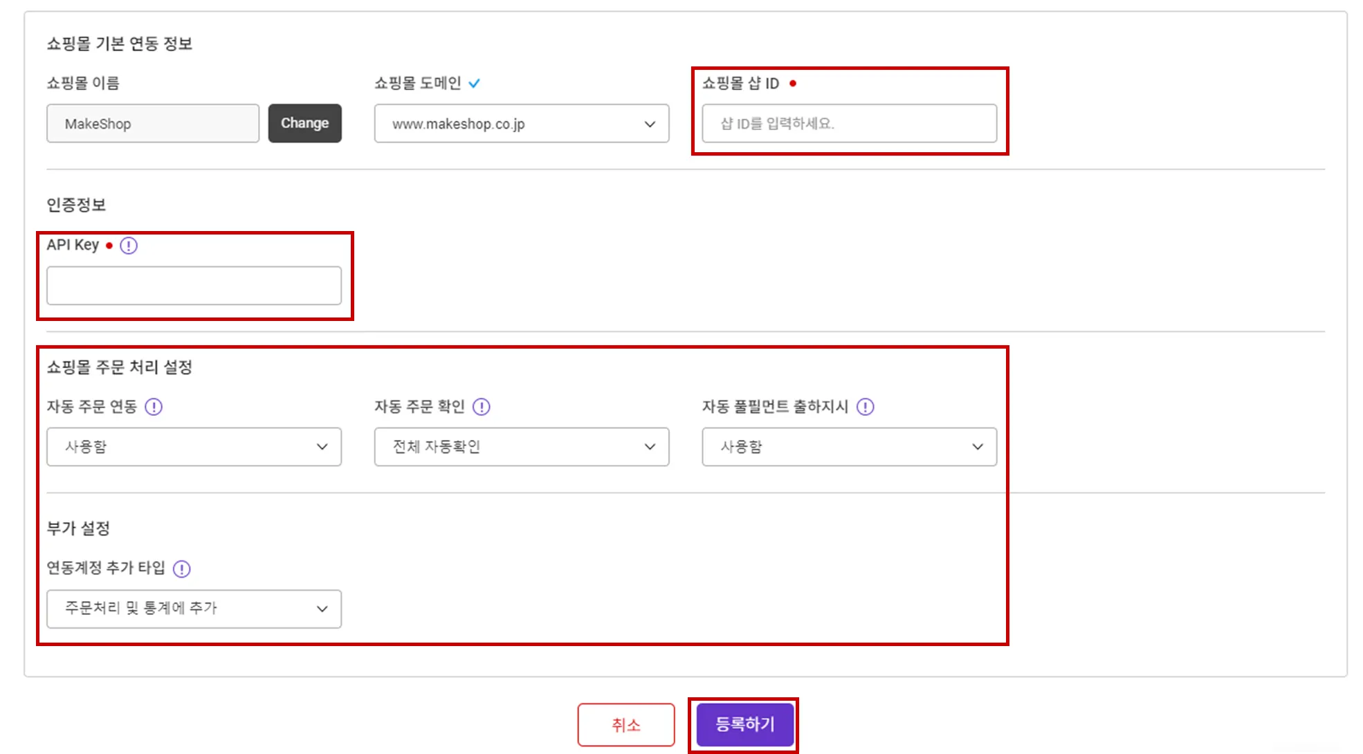 API 연동 설정에 필요한 정보들을 입력하고 등록해주세요.