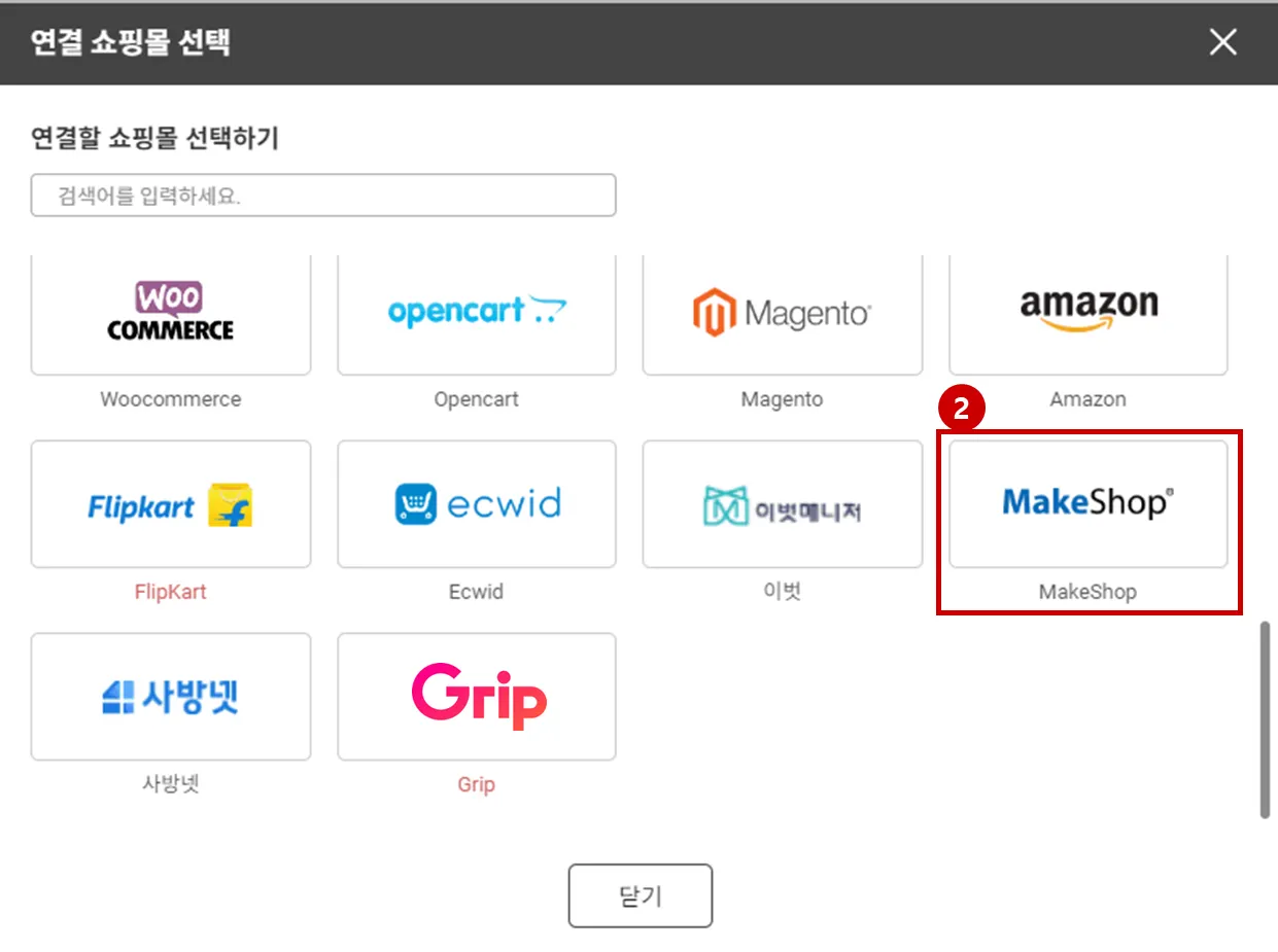 “MakeShop”을 선택한 후, 하단의 "쇼핑몰 연동 등록"으로 스크롤을 이동해주세요.