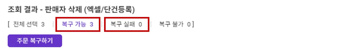 최초 주문 등록이 엑셀 등록 또는 단건 등록일 경우 복구 시도가 가능합니다.