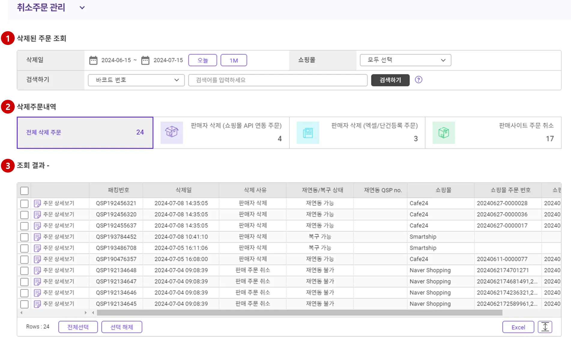 2-2. 취소된 엑셀 등록/단건 등록 주문 복구하기