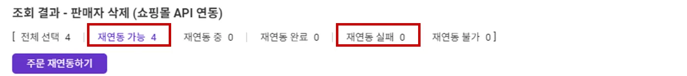 주문 재연동하기 버튼은 “재연동 가능” 또는 “재연동 실패” 를 클릭하실 때에만 노출됩니다.
