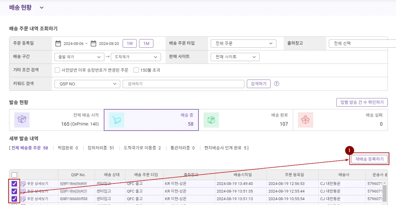 재배송이 필요한 주문을 선택하신 후, 우측 상단의 [재배송 등록하기] 버튼을 눌러주세요.