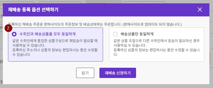 이어 나오는 재배송 등록 옵션을 선택 후, [재배송 신청하기] 버튼을 눌러주세요. 재배송 신청 후 주문을 편집할 수 있고, 판매자님의 편의를 위해 제공되는 옵션이므로 자유롭게 선택해주세요.