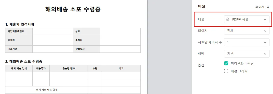 미리보기 항목에서 해외배송 소포 수령증 내용을 미리 확인할 수 있습니다.