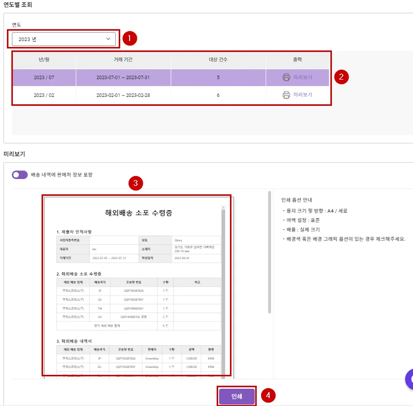 선택하신 연도에 발행 된 해외배송 소포 수령증 목록을 확인 후 인쇄하실 수령증을 눌러주세요.