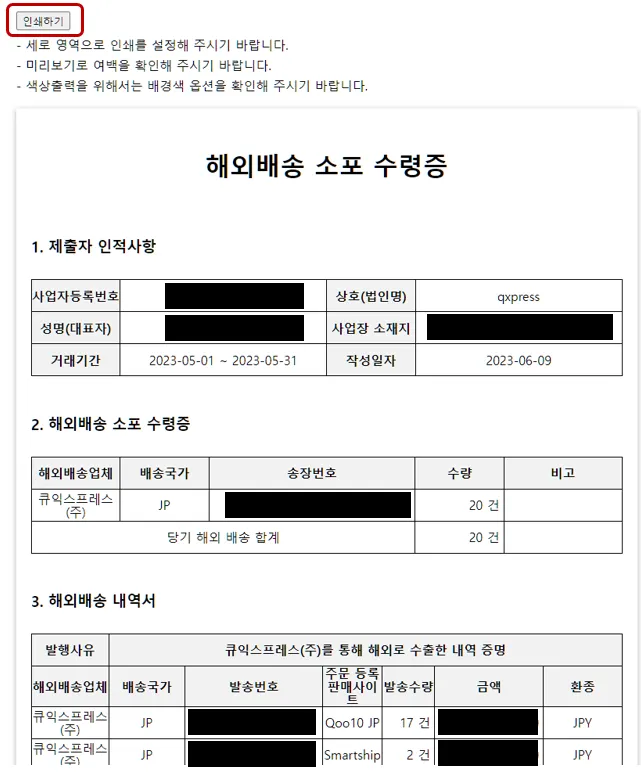 [인쇄] 버튼을 누르면 해외배송 소포 수령증 출력이 가능합니다.