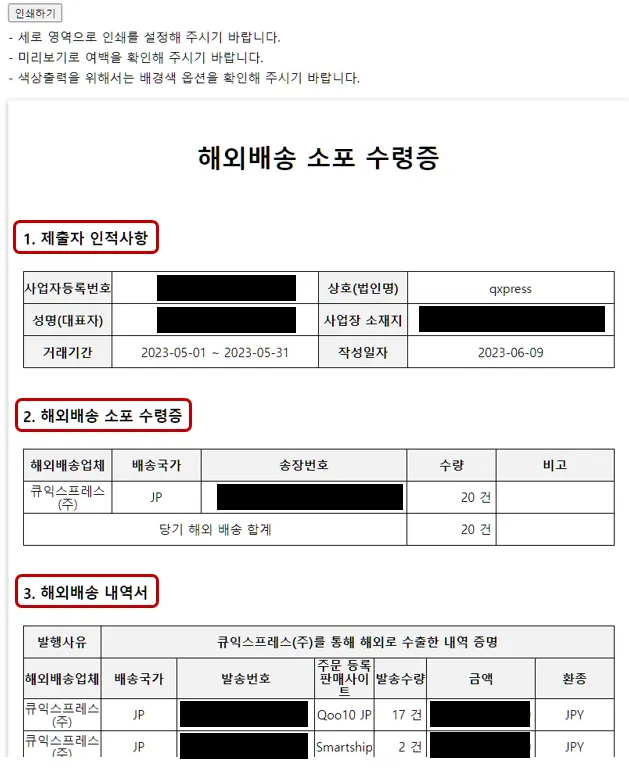 일반과세자가 영세율 증빙을 위해 예정신고시 또는 확정신고시 세무서에 제출하는 서류로 세무서에 제출하셔야 할 서류는 ‘해외배송소포수령증’ 및 ‘해외배송내역서’ 입니다.