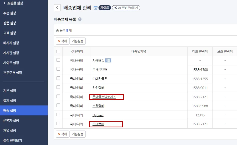 Cafe24 배송업체 관리 페이지에 사용하시는 택배사가 추가되지 않은경우, 주문 발송처리가 실패할 수 있습니다. 해당 페이지에서 사용하실 택배사를 사전에 추가 부탁드립니다.