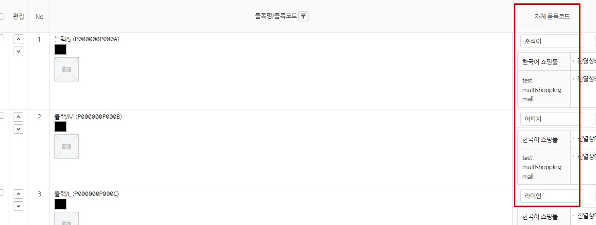 Cafe24 상품 화면에서 상품별로 코드를 입력합니다.