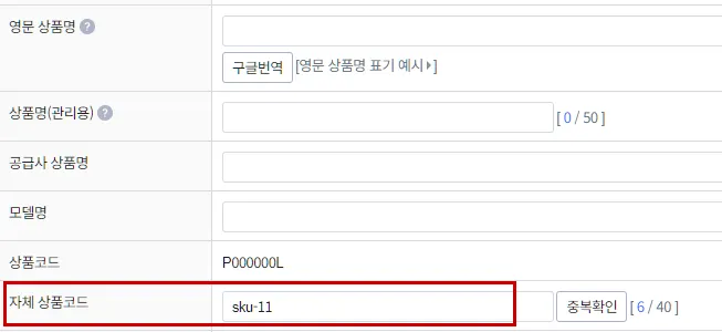 옵션이 없는 단일 상품일 경우는 “자체 상품코드”를 입력하세요.