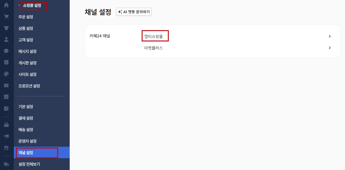 쇼핑몰 설정 > 채널 설정 > 멀티쇼핑몰을 눌러주세요.