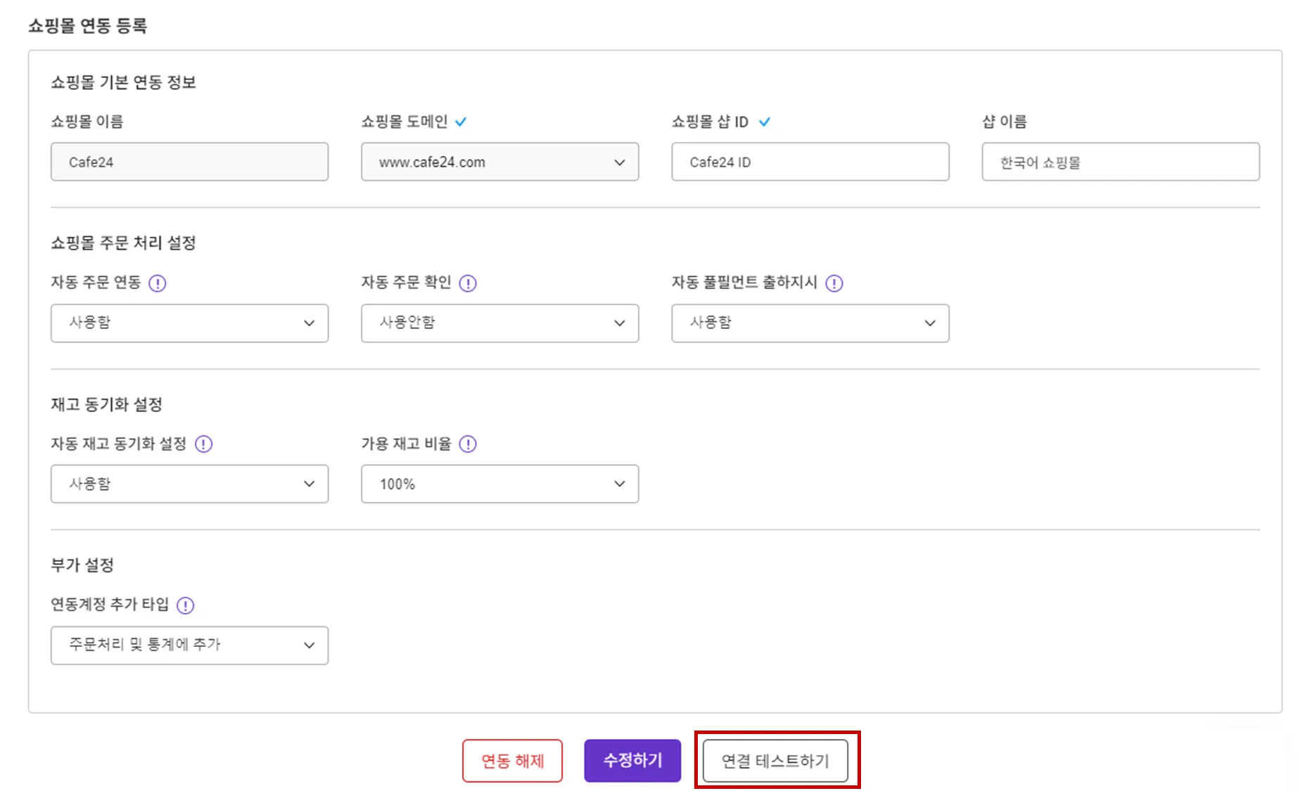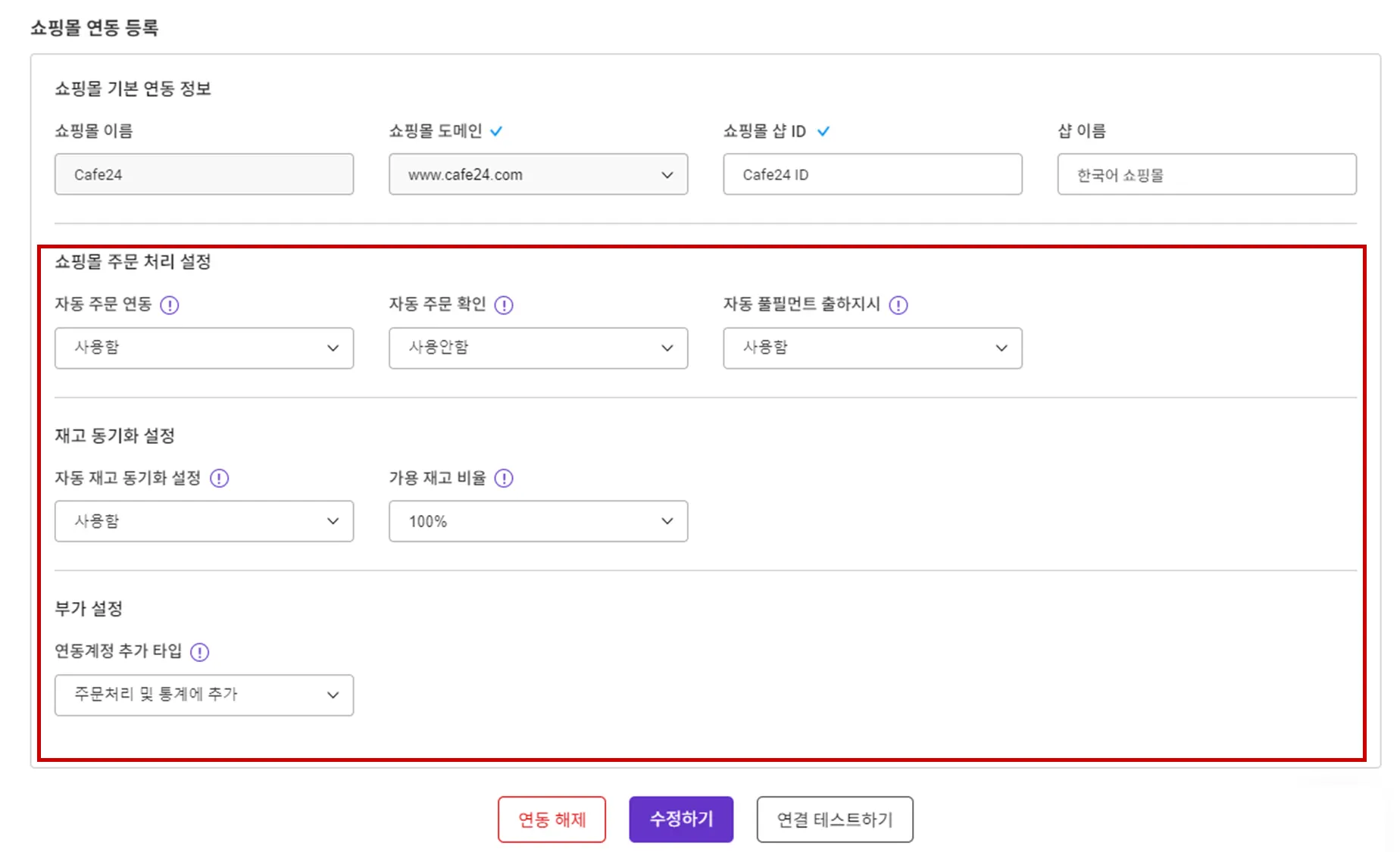 API 연결 설정 시에 주문 및 상품 연동 동작의 세부 사항을 조절할 수 있는 옵션이 있습니다.