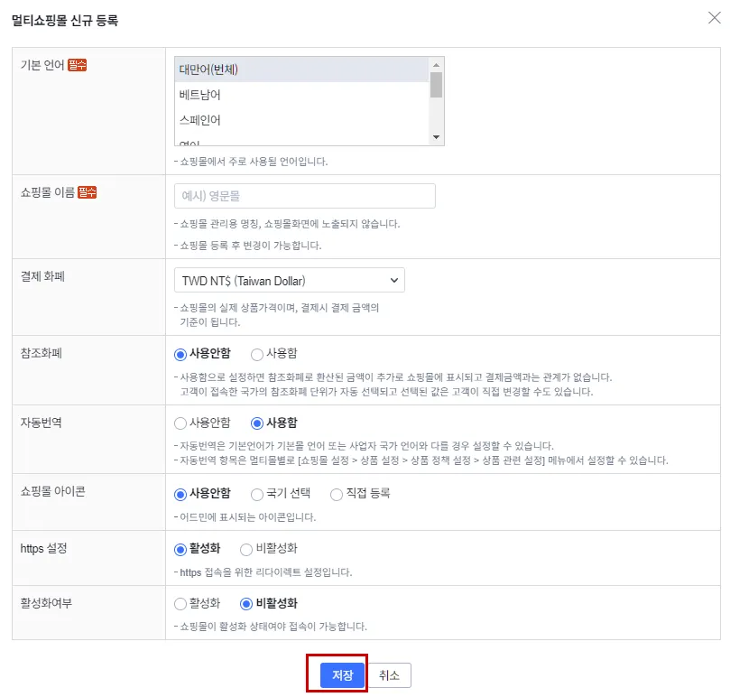 설정 완료 후 [저장]버튼을 누르면 멀티쇼핑몰이 추가됩니다.