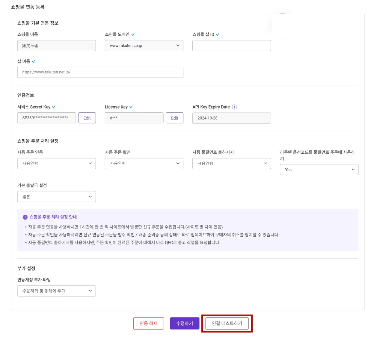 스마트십 시스템이 쇼핑몰의 주문을 가져오고, 주문 확인 및 발송 처리를 원격으로 하기 위해서는 API 연결이 필요합니다. 본 문서는 Rakuten 서비스에 대한 API 연결 설정 방법을 설명합니다.